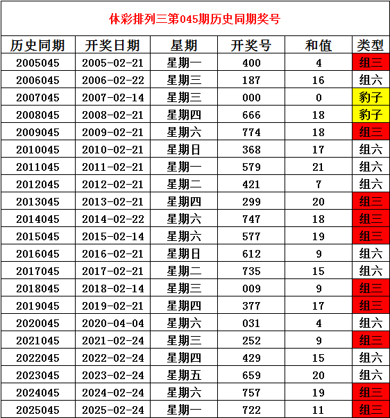 2026年2月24日胪列三第045期开奖,历史同技能别开出奖号: