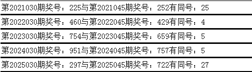与前期历史同时奖号对比分析,在最近五年开奖中,第030期同时奖号与第045期同时奖号齐出现了相易号码: