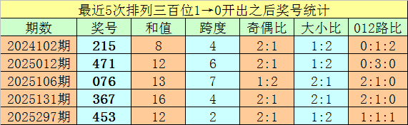 1、陈列三最近两期百位号码辩认开出1和0,历史上百位号码衔尾两期辩认开出1和0的奖号出现了65期。前五期开出之后其下期奖号辩认为:215、471、076、367、453;