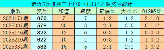 1、陈列三前两期个位辩认开出号码9和1,历史上个位号码衔尾两期辩认出现9和1时,共有86次。在最近5次出当前,其下期辩认出现号码:070、578、822、622、583;