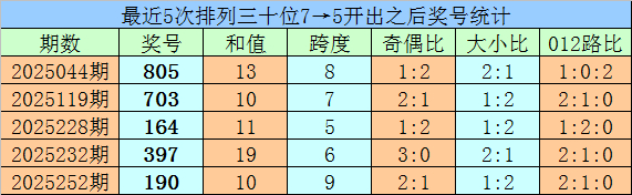 1、最近两期陈列三十位号码开出号码辩认为7和5,历史上十位号码衔尾两期同期出现号码7和5的奖号共开出84期。最近五次下期开出号码为:805、703、164、397、190;