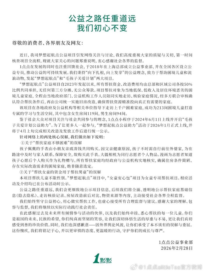 2月28日,奶茶品牌“少许点”发文回话“资助男孩戴千元电话腕表”等争议问题,暗意后期还将透明、全面地作念好必要的信息公示。此前,该品牌在酬酢平台发布匡助讳饰男孩改善学习环境的帖子,像片中受助男孩戴有价值千元的电话腕表,桌上有漫画书,立异后的房屋看起来也宽绰亮堂。有东说念主质疑,这么的生计要求亦然讳饰家庭吗?送漫画书能促进学习吗?