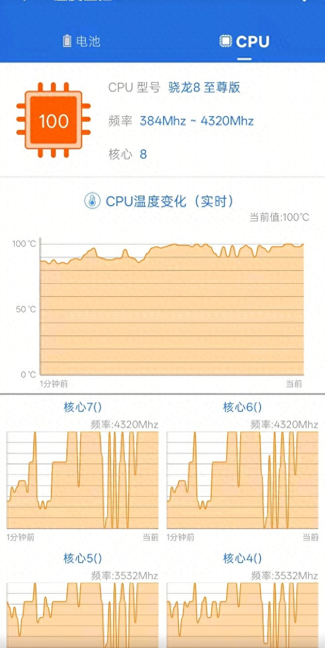 进一步分析各个中枢的运转状态不错发现,中枢七和中枢六的频率都保握在了最高的四千三百二十兆赫兹。这两个中枢粗俗被以为是芯片的性能中枢,肃穆处分游戏或者视频渲染等高强度任务。它们同期以满频率运转会产生深广的热量,而散热系统昭彰无法实时将这些热量排出机身外部。与此同期,中枢五和中枢四的频率也达到了三千五百三十二兆赫兹,这个频率天然略低于最高频率,但依然属于止境高的水平。其余的中枢天然莫得在图片中详备列出,但从举座的温度线路来看,它们大要率也处于高负载状态。八个中枢同期全速运转,再加上骁龙8至尊版自己集成度极高,里面还包含了图形处分器和东谈主工智能引擎等模块,这些模块在高负载下一样会发烧,最终总共热量重复在一王人就形成了此次一百摄氏度的顶点情况。