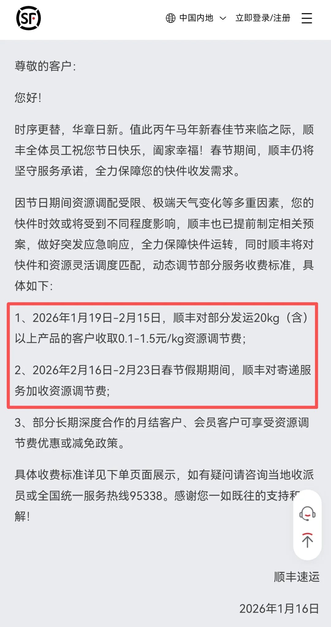 顺丰速运在1月16日发布的《2026年春节本领就业公告》中明确,将对快件和资源天真调度匹配,动态改动部分就业收费设施。2026年1月19日—2月15日,顺丰对部分发运20kg(含)以上居品的客户收取0.1—1.5元/kg资源改动费;2026年2月16日—2月23日春节假期本领,顺丰对递送就业加收资源改动费;部分恒久深度合营的月结客户、会员客户可享受资源改动费优惠或减免策略。