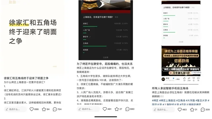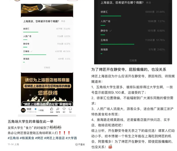 {jz:field.toptypename/}2025年末,当烤匠官方微信号抛出“上海首店开在哪”的投票选项时,只怕连品牌方我方皆没思到会演形成一场高校之间的“抢鱼大战”。徐家汇、东谈主民广场、静安寺、五角场、淮海路,几个上海地标摆在台面上,初期的投票走势适当旧例买卖逻辑——徐家汇以碾压之势领跑。