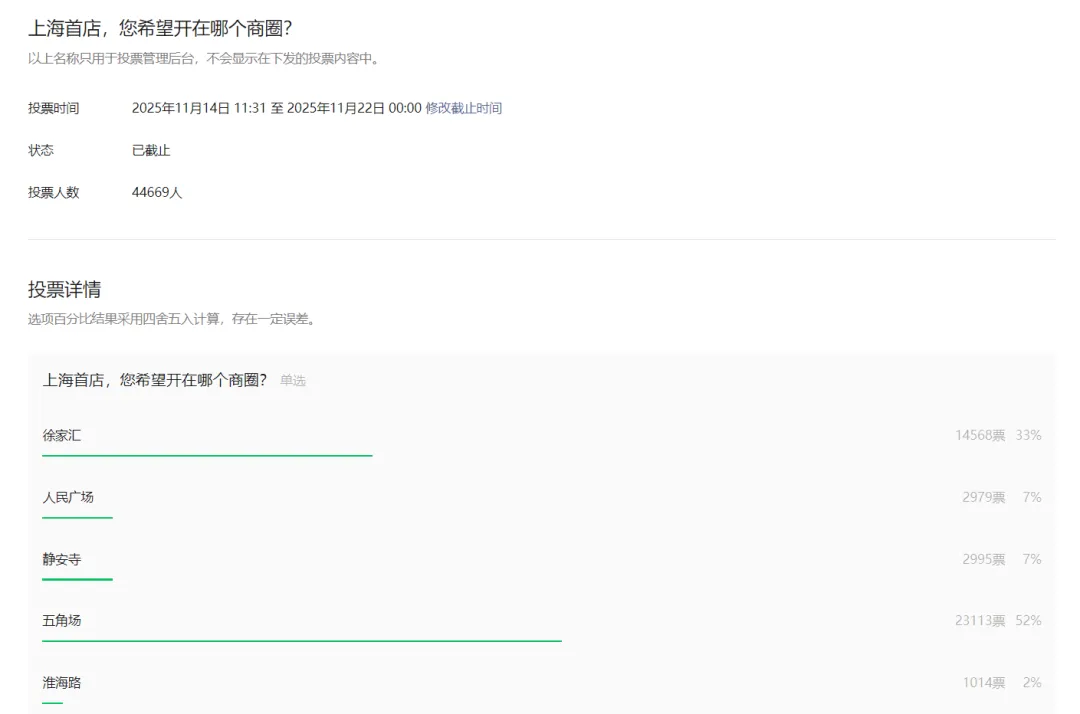 最终的数据知道,这次投票蔼然东谈主数约11万,本色参与投票东谈主数近4.5万东谈主。其中,五角场以23113票、跳动半数的得票率完成逆袭,获胜决定了这家“列队王首店”的落脚点。