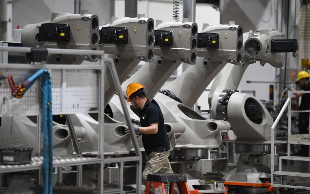 2025年3月25日在广东佛山市好意思的库卡智能制造科技园拍摄的工业机器东谈主产线车间。新华社记者 邓华 摄