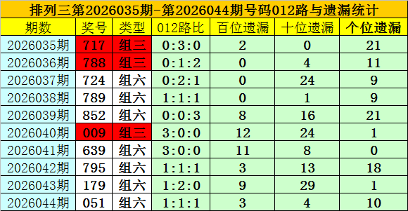 开奖转头:摆列三第2026044期奖号为:051,类型为组六,号码012路比为1:1:1,百十个位号码直选折柳遗漏3期、4期和10期。
