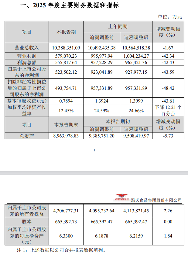 2025年,温氏股份结束买卖总收入1038.84亿元,同比下降1.67%;包摄于上市公司推进的净利润52.35亿元,同比下降43.59%;基本每股收益0.7894元,同比下降43.61%。