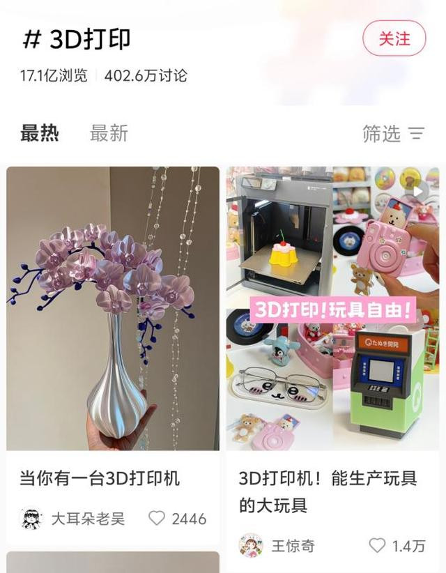 数据显现,小红书上“3D打印”运筹帷幄话题的累计浏览量已越过17亿,旧年搜索量同比增长238%。在抖音,“3d打印”词条的播放量致使高达101.1亿次,“3d打印笔”“玩转3d打印”“3d打印作品”“3d打印玩物”等话题,播放量均达到了数亿次。