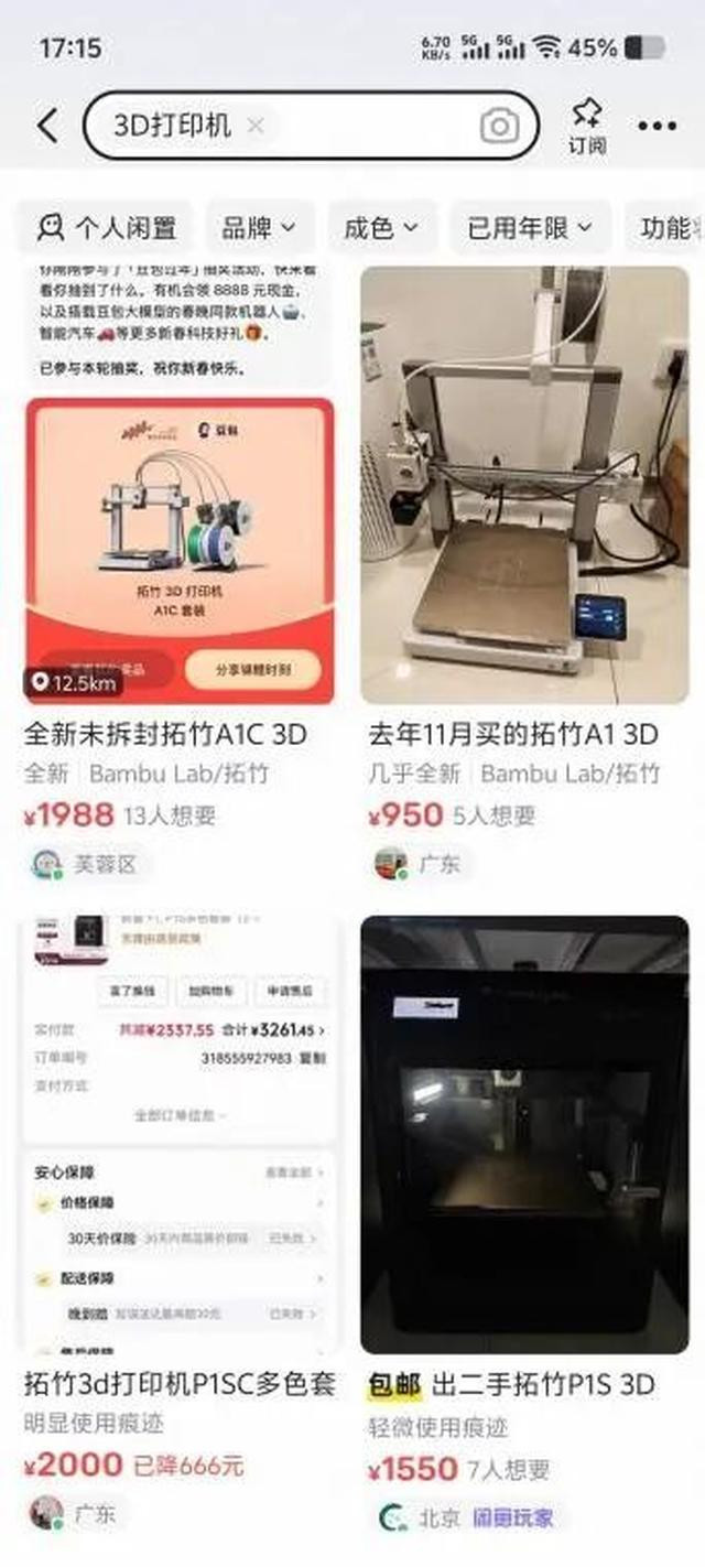最直不雅的即是二手市场的数据。原价2300元傍边的拓竹P1系列在闲鱼跌至1900元傍边;被时间烧毁的第一代3D打印机,更是当废铁卖,售价皆集在四五百元,却依然乏东说念主问津。