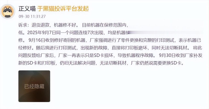 无专有偶,在黑猫投诉平台,对于拓竹产物性量和售后的投诉多达400余条,问题多皆集在部件损坏、打印隆重性、售后反映速率等方面。其中有效户吐槽,拓竹的机器使用700余小时后,团结个问题流畅出现7次,返厂维修后寄回,恶果又出现新的故障。