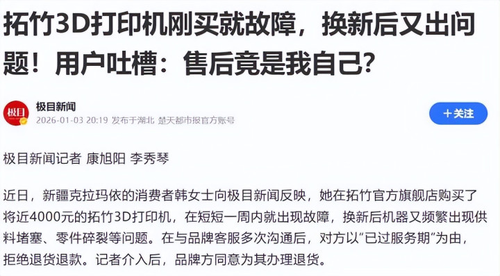 本年1月,就有奢靡者暗示,她花近4000元购买的拓竹打印机,一周内就出现故障,换新后机器又泛泛出现供料堵塞、零件破裂等问题。在与客服反复交流明,对方以“已过作事期”为由拆开退货,临了在媒体介入下才得以科罚。