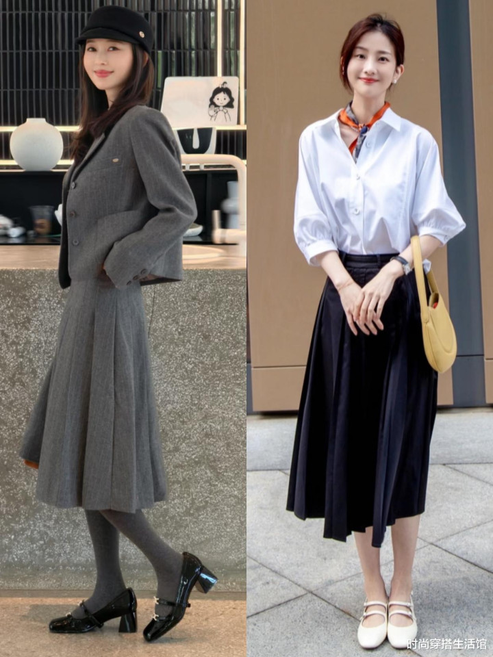 百褶裙+低跟玛丽珍鞋