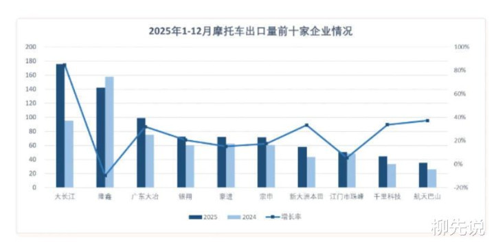 在企业竞争层面,2025年中国摩托车出口企业的排行发生了引东说念主注主义变化。具体来看,第6至10名的出口企业秩序为:宗申、新大洲本田、江门市珠峰、重庆沉科技、航天巴山。这些企业组成了中国摩托车出口的中坚力量。其中,宗申凭借其在能源系统规模的时代积存和国外多国的腹地化运营,保合手相识增长。