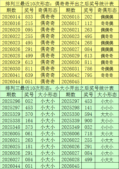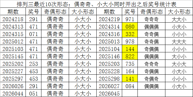 成列三最近10次同期开非常偶款式:偶奇奇和大小款式:小大小时其奖号别离为:291-471-071-471-471-471-253-453-453-291-051,下期别离开出号码为:971-080-332-978-144-822-735-164-141-084,详备统计见下表: