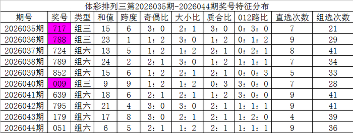 开奖公告:体彩成列三第2026044期开出奖号:051。组六,有重号:1,奇偶比2:1,大小比1:2,012比1:1:1,和值6,跨度5。