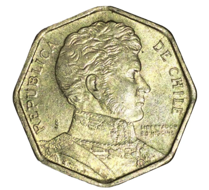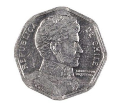 2、七边形洞开硬币(5比索)上的贝尔纳多·奥希金斯·里克尔梅