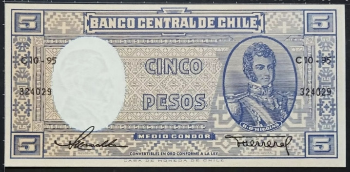 1、老版5比索洞开纸币上的贝尔纳多·奥希金斯·里克尔梅